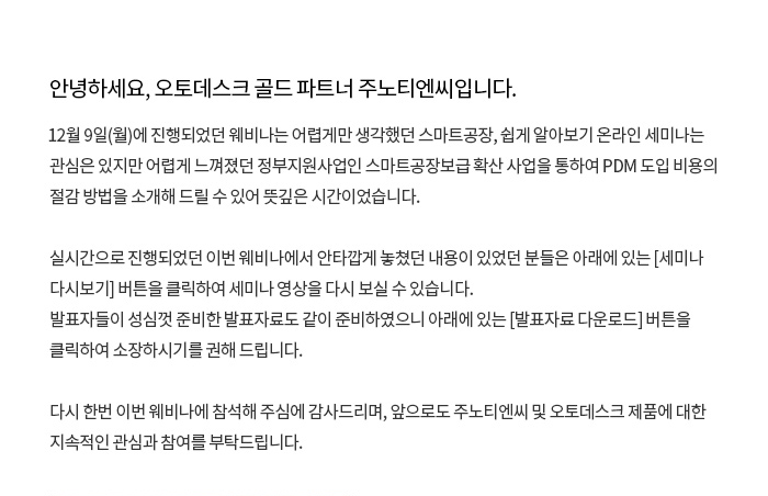 다시 한번 이번 웨비나에 참석해 주심에 감사드리며, 앞으로도 주노티엔씨 및 오토데스크 제품에 대한 지속적인 관심과 참여를 부탁드립니다.